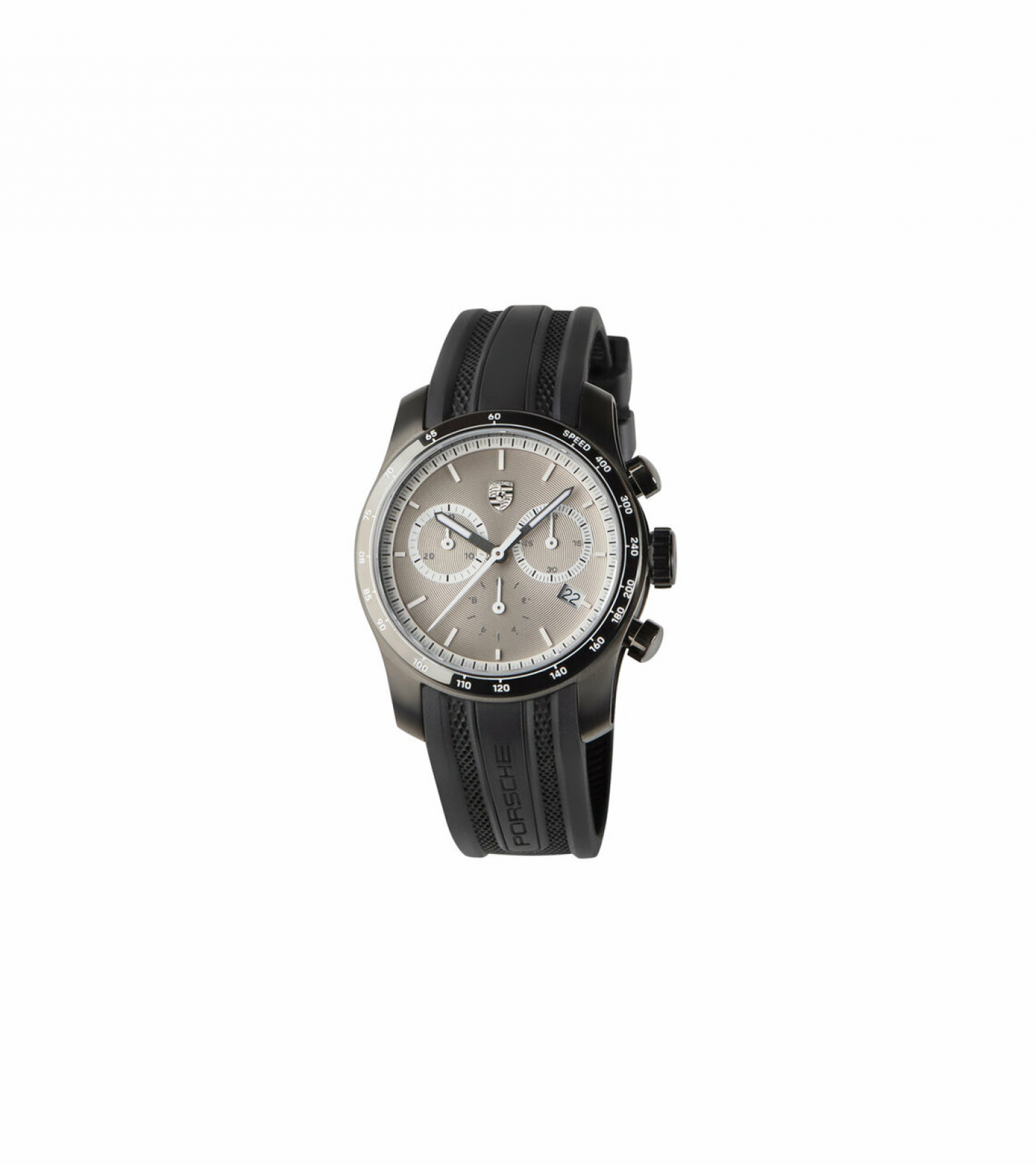 Ronda movement with 13 jewels and water- resistant casing (10 ATM). With chronograph function. Two-part stainless steel casing with PVD coating in dark silver. Porsche Crest appliqué at 12 o’clock. Sapphire glass with anti-reflection treatment on one side. Rubber strap in black with honeycomb structure on the top and tyre relief on the bottom. Satinised stainless steel pin clasp with engraved ‘PORSCHE’ logo in dark silver. Diameter: 38mm. In black/ dark silver/ magnetic. Swiss made.