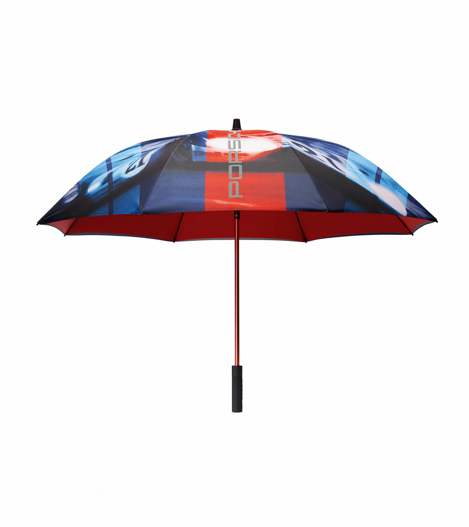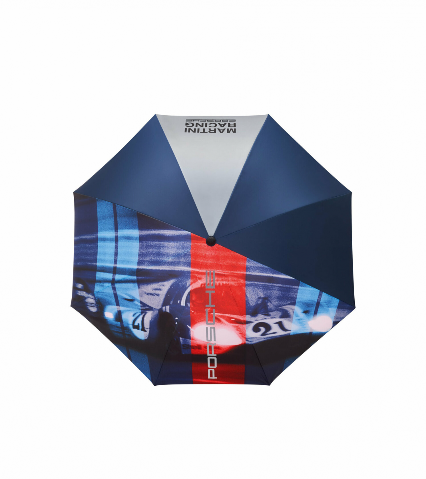 XL umbrella – MARTINI RACING. Large umbrella with two-ply canopy and MARTINI RACING printed motif of the 917 long tail. With Dupont Teflon coating and silver reflective elements. Windproof system with fibreglass rods. Plastic handle with embossed ‘21’ on the bottom. Length [ closed ]: 88.5 cm. Diameter: approximately 120 cm. In Dark Blue.