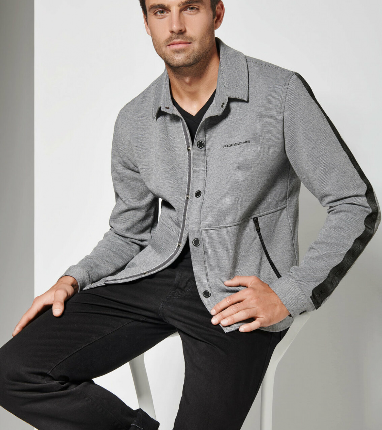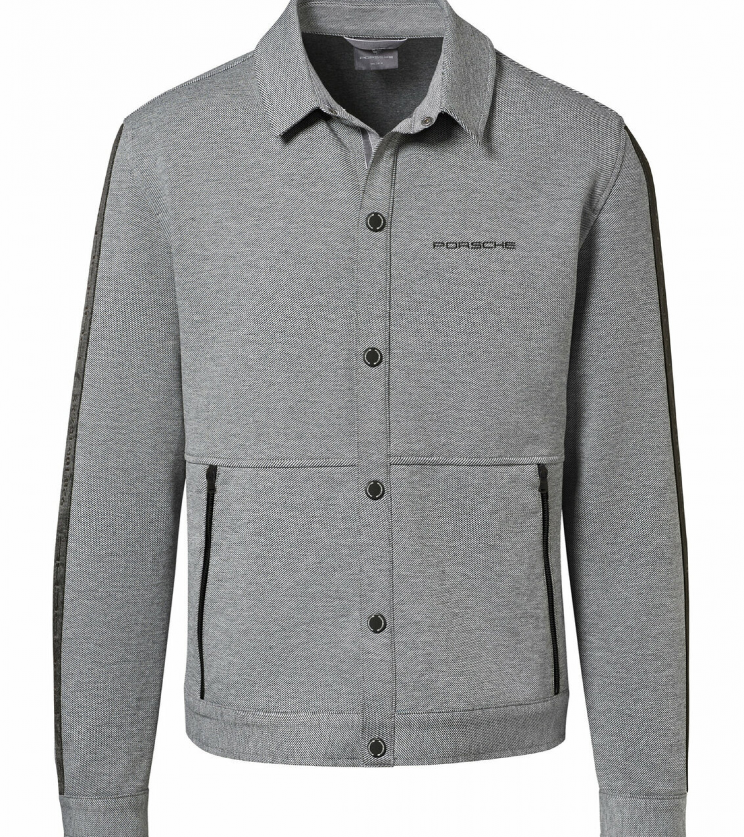 Sweatjacket in wtill optic. With black lining. With shirt collar. Two side pockets and one inner press button. Button placket and slits at the sleeves with decorative ribbon. Porsche logotype on the chest. Decorative ribbon on arms debossed with partnumber of Porsche 928 v-belt.