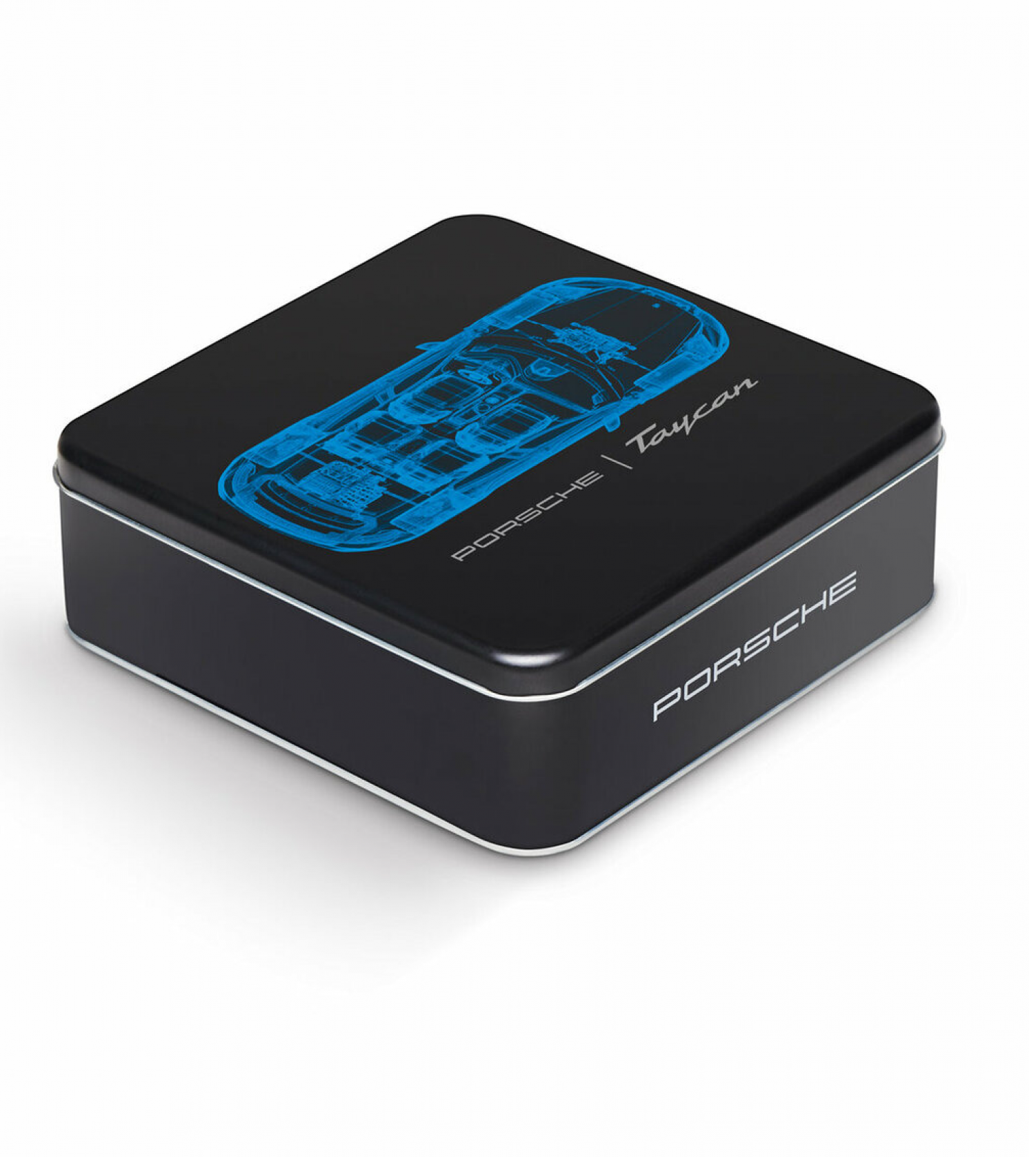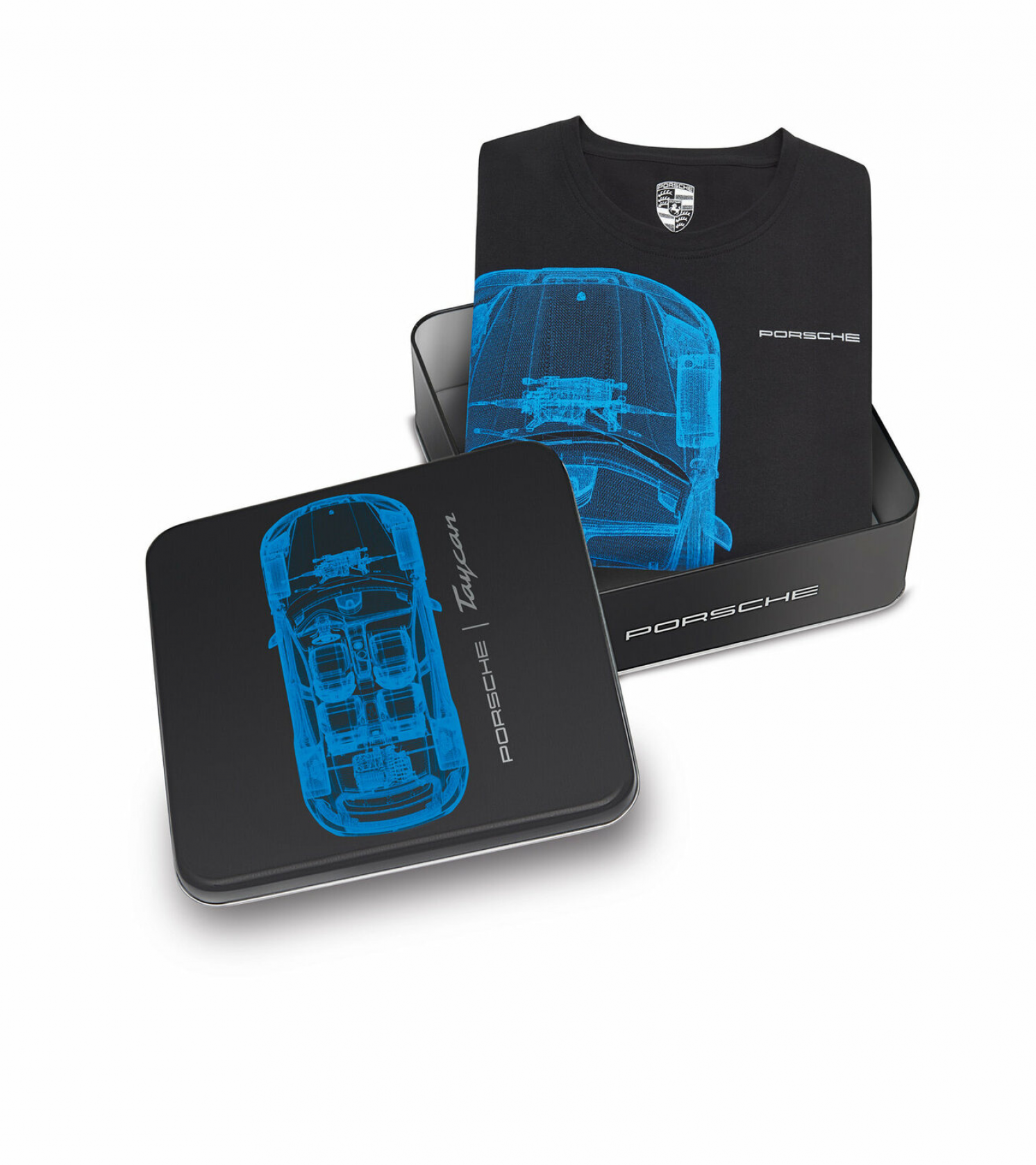 Porsche Taycan Collector's Shirt. Porsche Taycan front print. Limited (we won't name any number of limitations!). Packed in an exclusive metal box, imprinted with the same motive. Postcard with the same motive, as well as further explanation of it. Very soft t-shirt quality. 100% cotton. Black/Blue. Unisex.