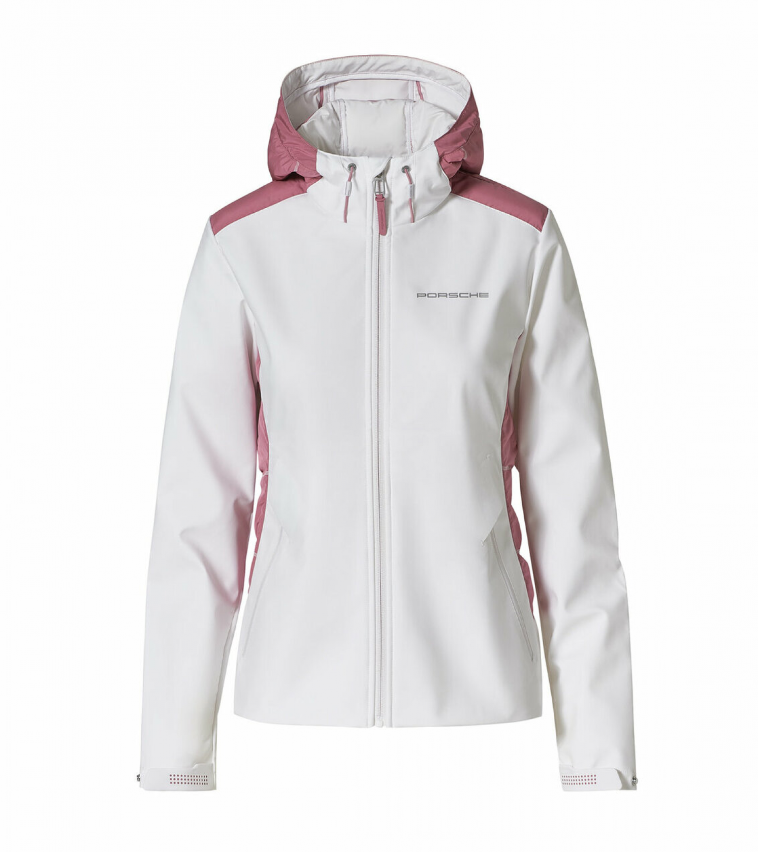 Padded jackets with hood. Water column 3.000 mm and breathability 3.000 g/m2/24 h, protects against wind and weather. Front part, sleeves and hem to back part made of hard shell fabric with fleece inside. Hood, shoulders, back and side panels are made of padded chambers woven in contrast. Laser-cut side pockets with zip. Decorative perforations on sleeve bars. Adjustable sleeve straps with concealed press studs. Reflective Porsche logo on the chest. White/pink. Ladies.