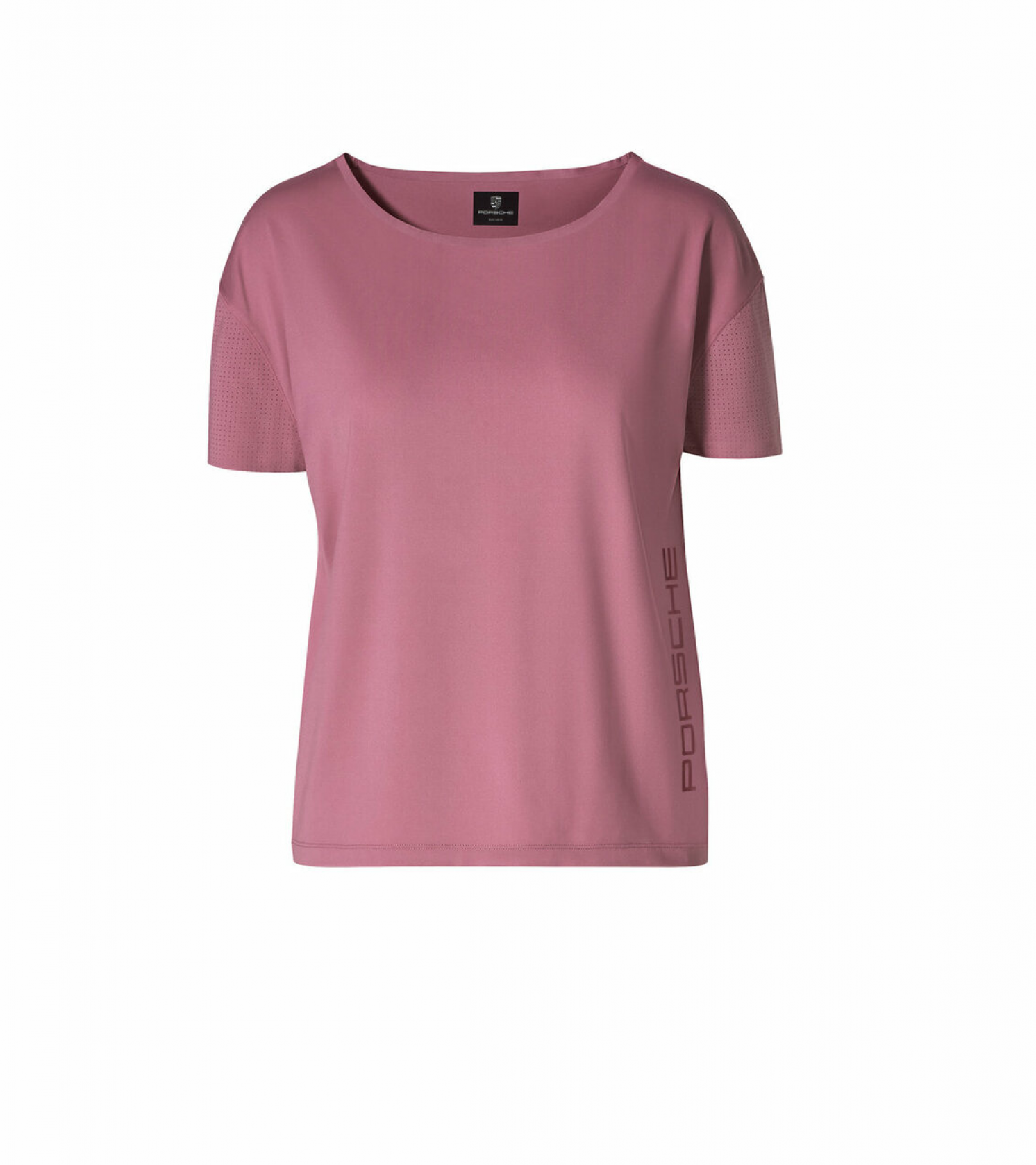 Loosely cut T-shirt with perforated sleeves and wide neckline. Made of functional jersey, breathable and quick-drying. Further perforation on the back. Large Porsche name sign printed on front in glossy transparent. Porsche name sign on the back. Laser-cut and glued edge on collar and sleeve hem. Pink. Ladies.