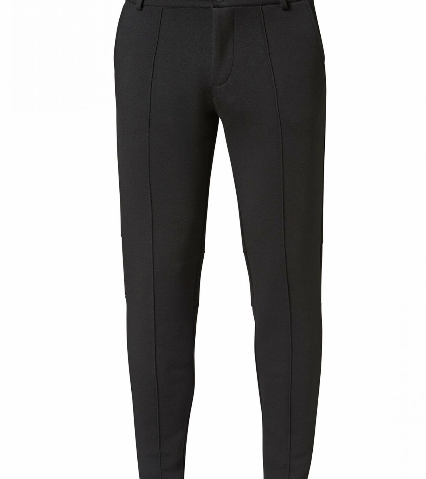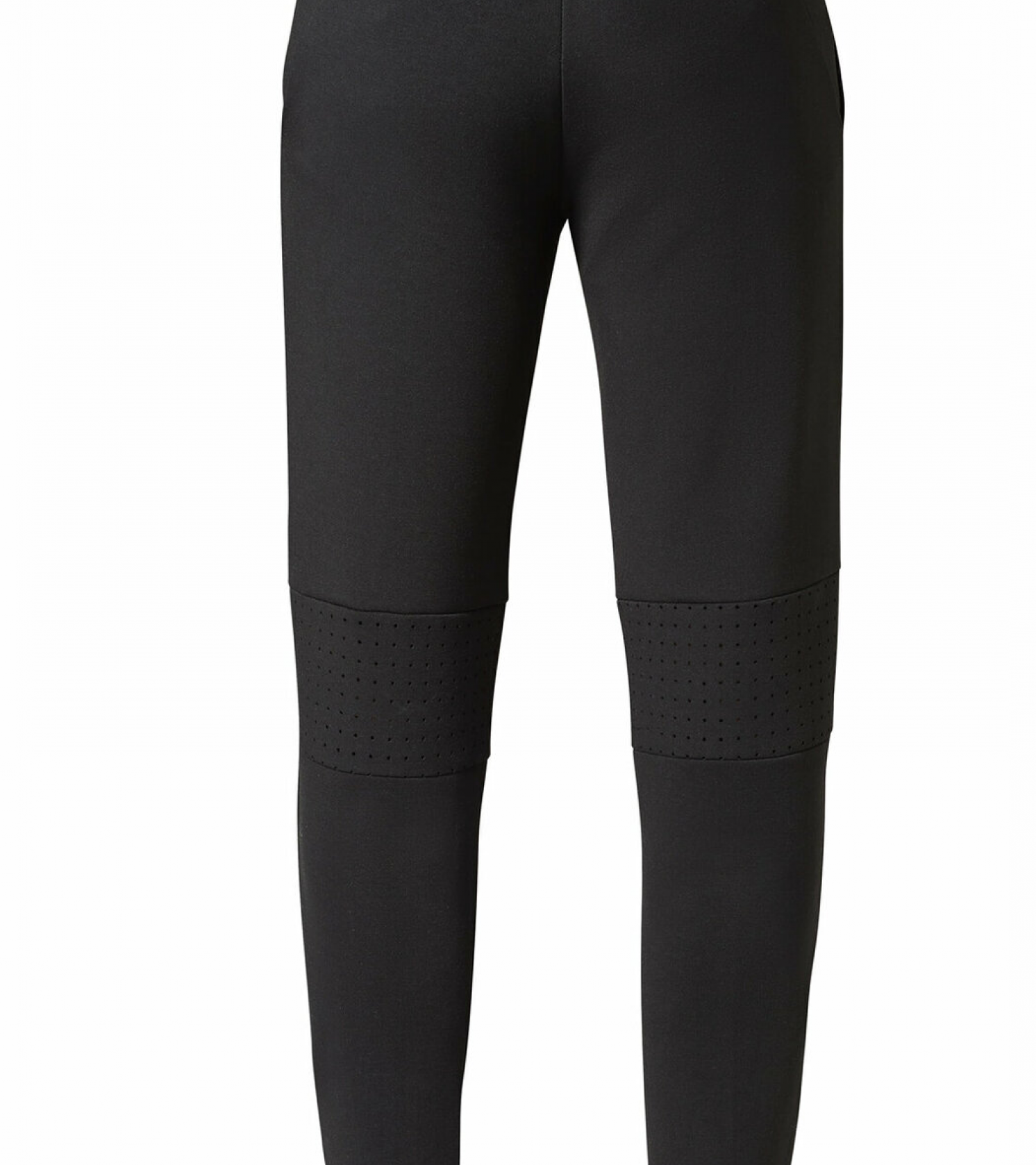 Black sweat pants with pleats, tucks and perforated inserts in grey melange. Waistband with button, zipper and belt loops. Two side pockets. Second hidden zippered side pocket on the right for personal belongings. Left side pocket with Porsche logotype printing. Zippered back pocket with decorative tape in black. Hollow of the knee with perforated insert.